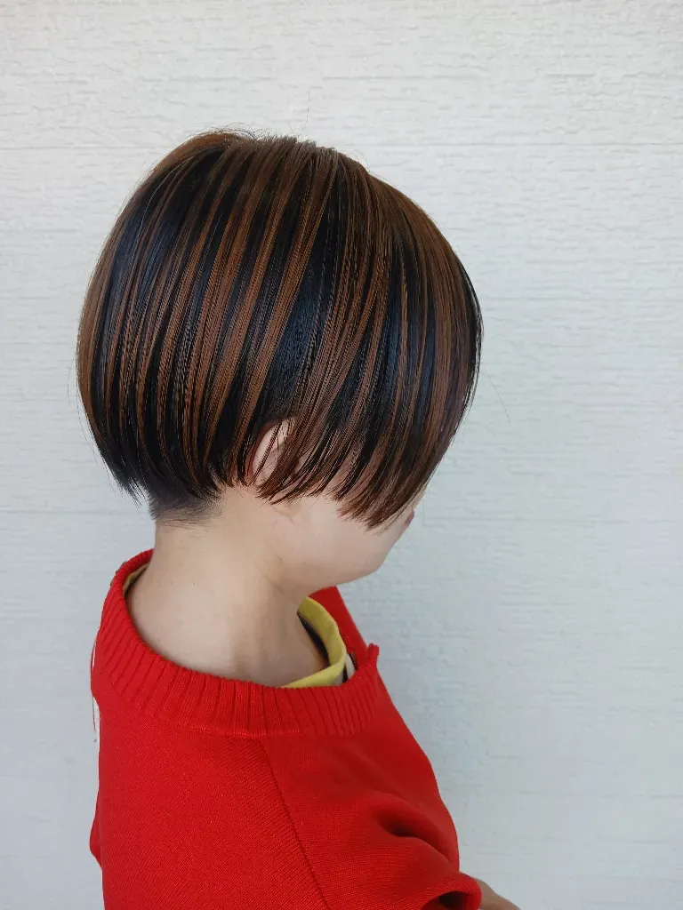写真のお客様は白髪は少なく、いつもショートカットの方です。半年に1回のペースで染められます。ブリーチなしの「アンブレラカラー」表面の髪だけ染めるカラーです。地肌にカラー剤は付けません。なので頭皮ダメージが無く、ヘアダメージも最小限ですみます。しかも見た目は明るく見えます。